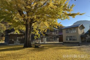 交流・観光拠点施設「喰丸小」は、校庭にある2本の大銀杏が黄色く染まり、昭和12年築の木造校舎との組み合わせが美しいスポットです。